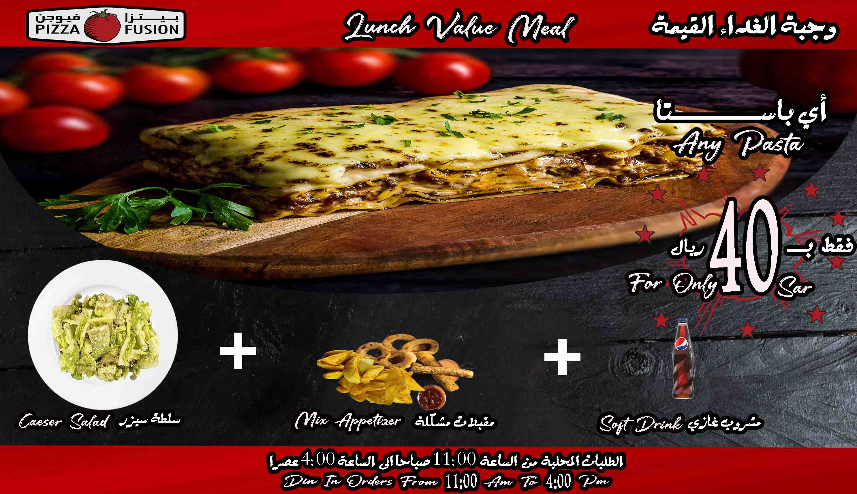 Buy any pasta or pizza Add 10 SAR to make it Value meal